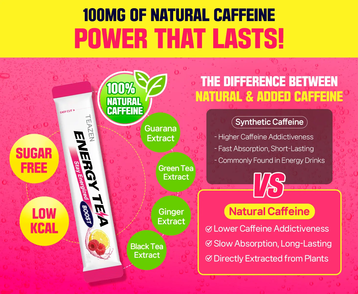 - Conditionné en sachets compacts et faciles à emporter, le TEAZEN Energy Tea Boost est conçu pour les personnes nomades. Il suffit de dissoudre un sachet dans 250 ml d'eau, de remuer et de déguster en quelques secondes. Au bureau, à la salle de sport, avant une réunion ou en voyage, ce thé s'adapte à votre rythme quotidien sans effort.