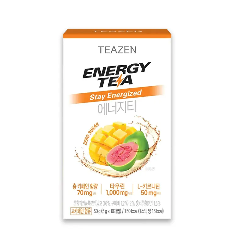 TEAZEN Energy Tea – Triple Boost – Boisson énergétique naturelle au guarana, thé noir, goyave et mangue – Sans sucre, faible en calories, hydratation instantanée et booster de concentration – 10 sticks