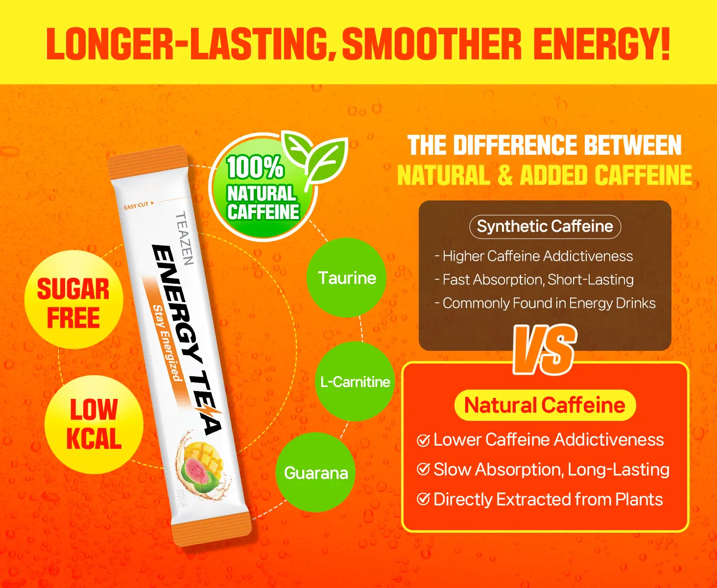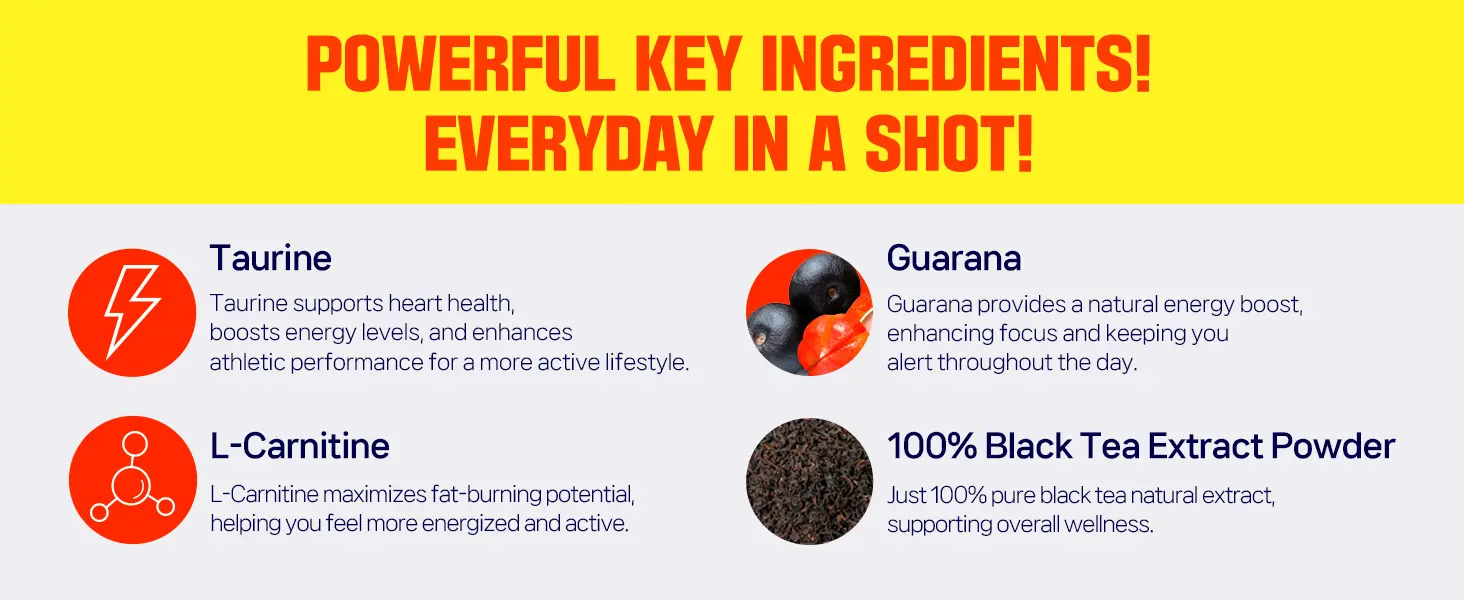 - Guarana provides a steady release of natural caffeine, while black tea extract offers antioxidants and a mild boost. Together, they enhance alertness, improve mental clarity, and deliver long-lasting energy—ideal for work, study, or fitness routines.