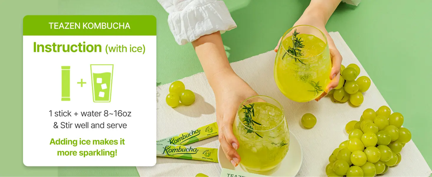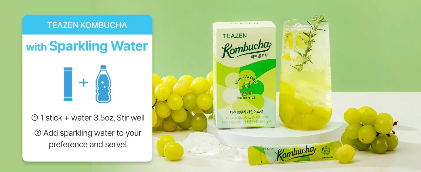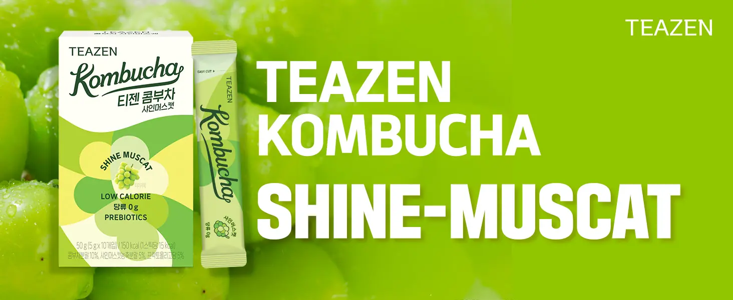 - Un goût naturellement sucré et rafraîchissant de raisins Shine Muscat avec une légère touche pétillante. TEAZEN Shine Muscat Kombucha offre une expérience de saveur pétillante et hydratante, alliant les bienfaits authentiques du thé fermenté à de la véritable poudre de jus coréen.